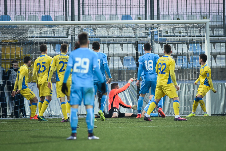 29. miuta: Blažič je odbil v kot z desne strani. Po podaji Mišića je z glavo streljal Šofranac, a brez težav za vratarja Golubovića.