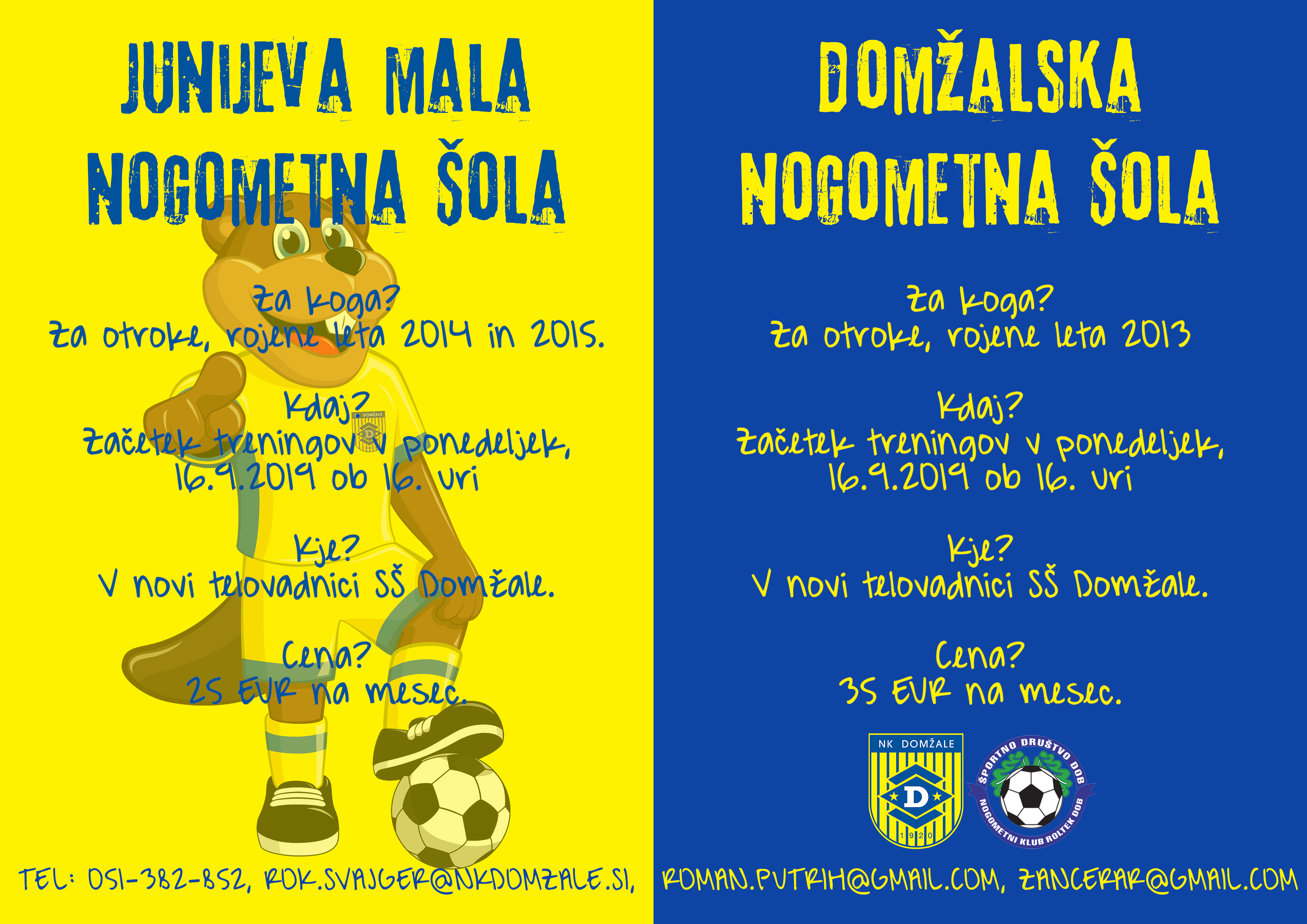 Junijeva nogometna šola, ki je namenjena otrokom rojenim leta 2014 in 2015 bo s treningi pričenjala ob 16. uri. Domžalska nogometa šola bo z otroci rojenimi leta 2013 vadila uro kasneje, torej ob 17.00. Mesečna cena Junijeve šole znaša 25 EUR, medtem, ko je cena Domžalske nogometne šola 35 EUR.