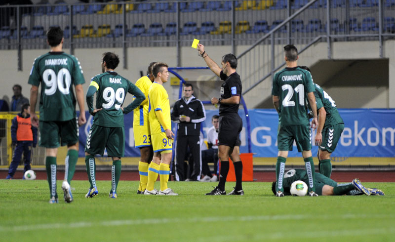 14. minuta: Zaradi prekrška nad Volaričem je rumeni karton prejel Joshua Parker.