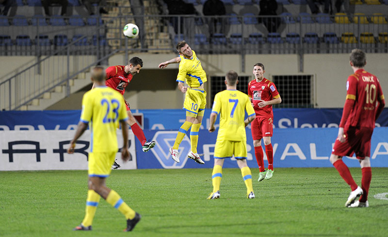 85. minuta: Rudar je prišel do kota z leve strani. Po podaji pred vrata je Radujko z glavo meril previsoko.