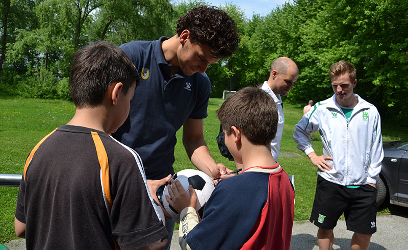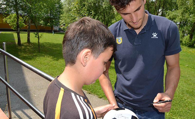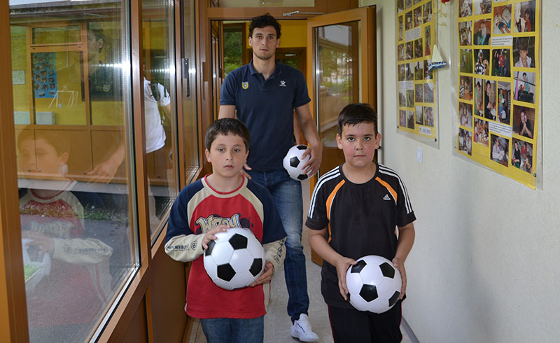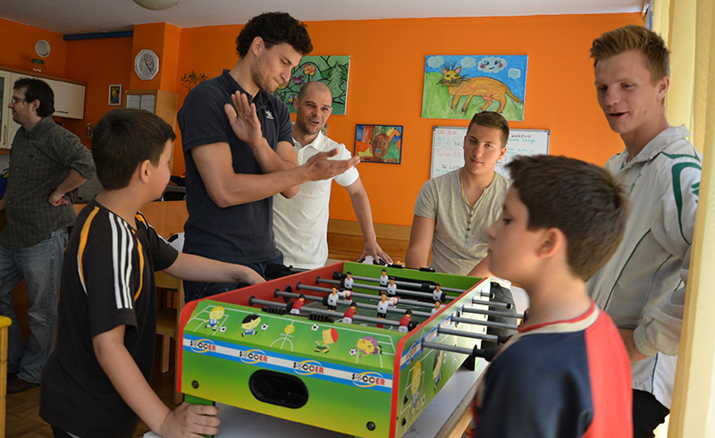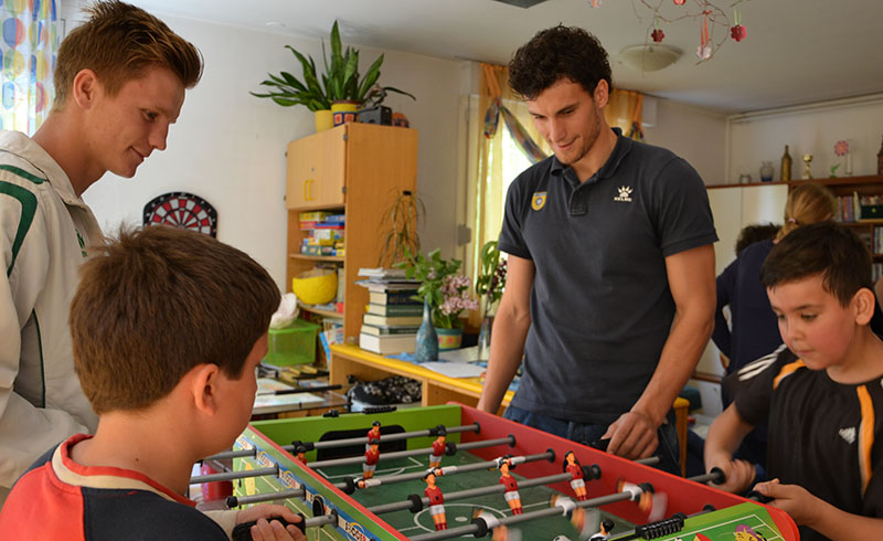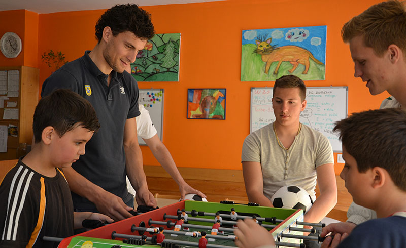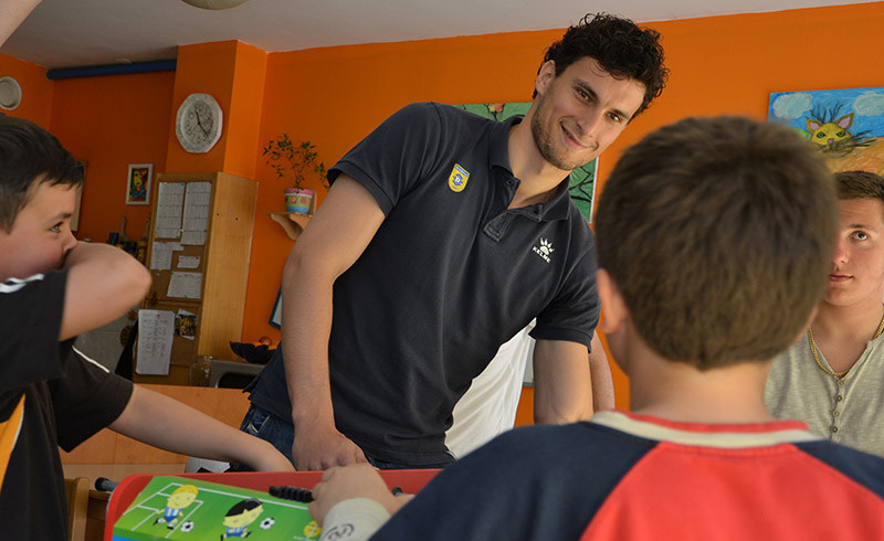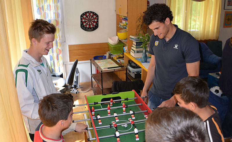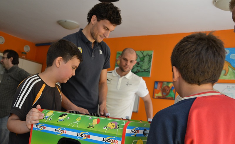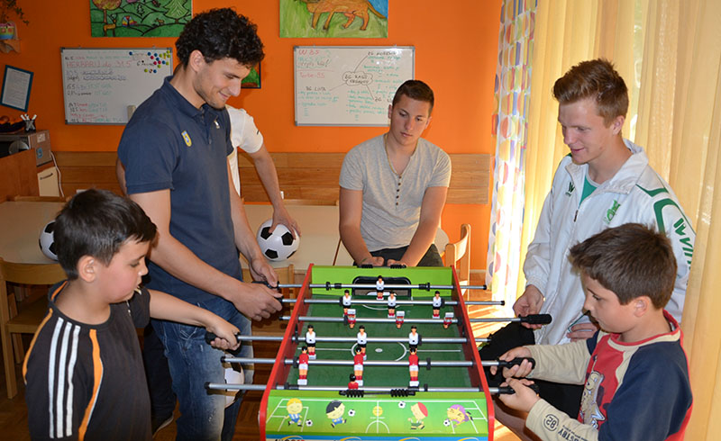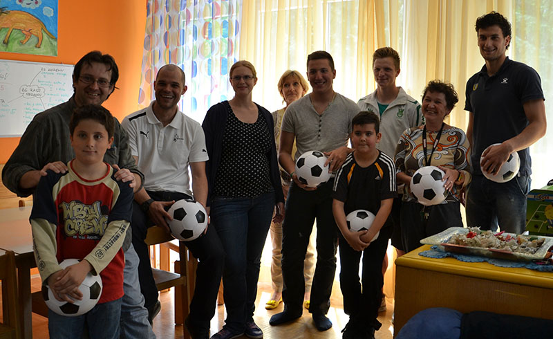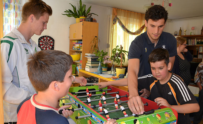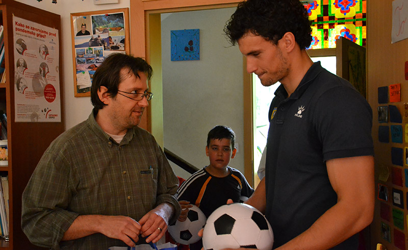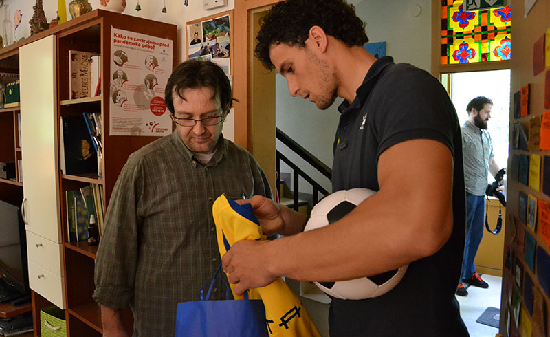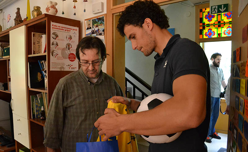 Darko in Anže sta dipl. soc. del. Pavlu Šinkovcu podarila dresa in žoge, z dvema prebivalcema doma pa sta odigrala tekmo na stolnem nogometu. V sproščenem vzdušju sta se rivala na igrišču strinjala, da je bil obračun odigran v Športnem parku Domžale, saj se je zmage veselil član Olimpije.